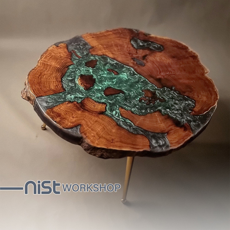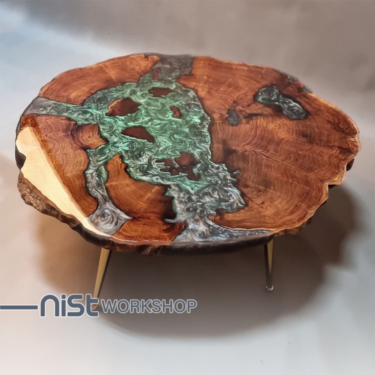 این میز با استفاده از چوب سنجد طبیعی، ظاهری ارگانیک و چشمنواز دارد. حفظ بافت و لبههای طبیعی چوب در کنار رزین سبز و مشکی، جلوهای خاص و هنری به آن بخشیده است. رگههای چوب و ترکیب رنگی رزین، حس طبیعی و لوکس را همزمان القا میکند.